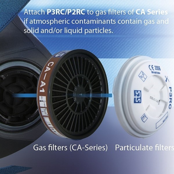 P3 pre-filter clips over STS gas filters to make a combined Particulate and gas filter- Certified and fully compliant with Australian/New Zealand Standard regarding respiratory protective devices AS/NZS 1716:2012